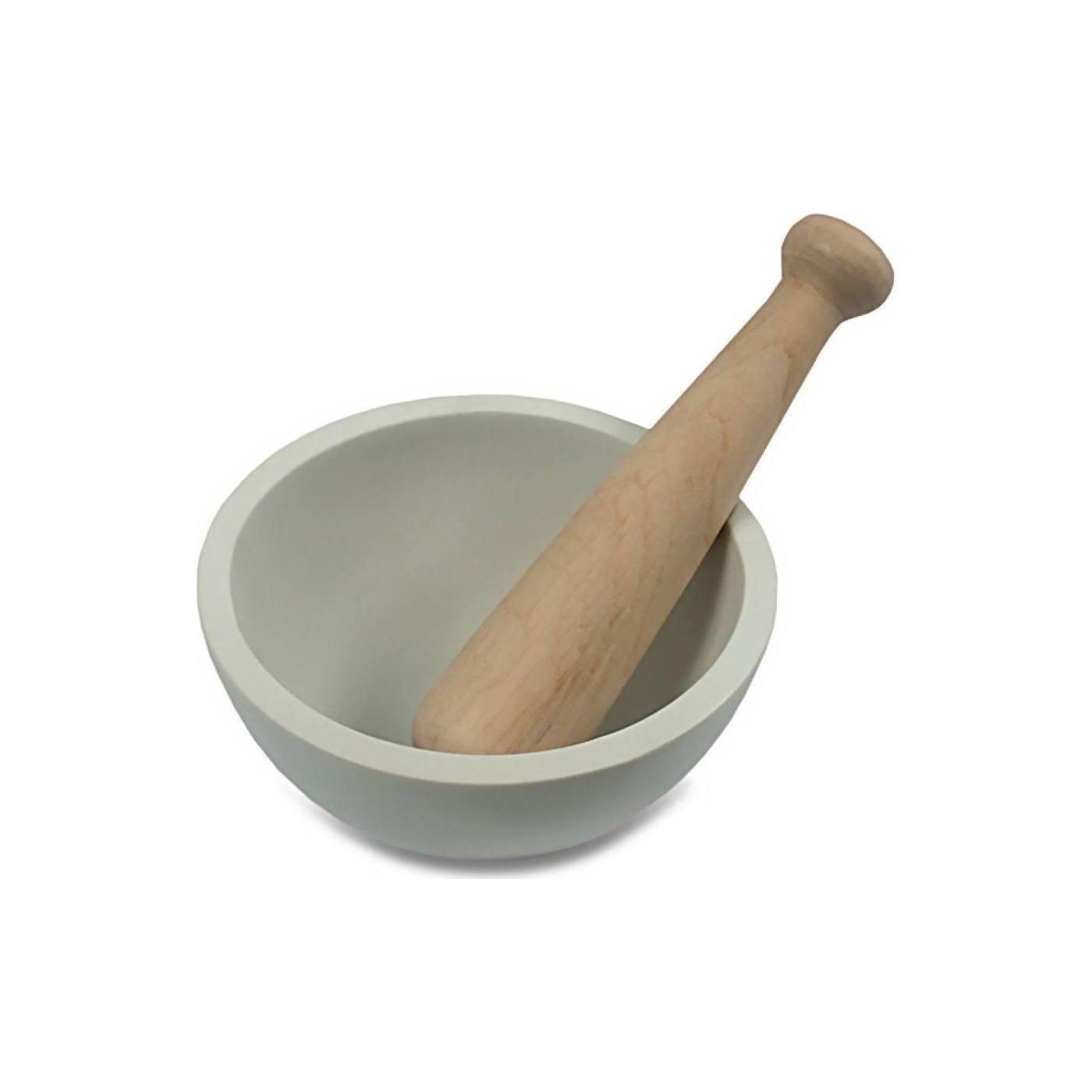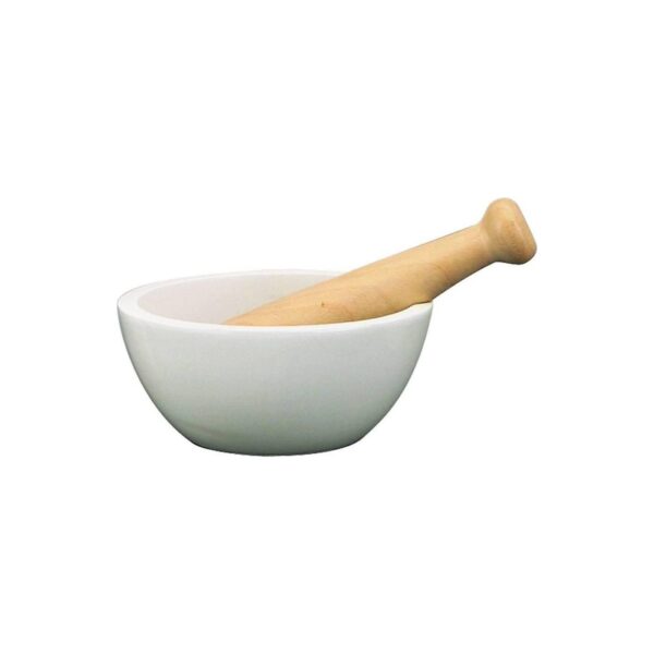 The mortar is made of porcelain, the pestle is made of wood beech.