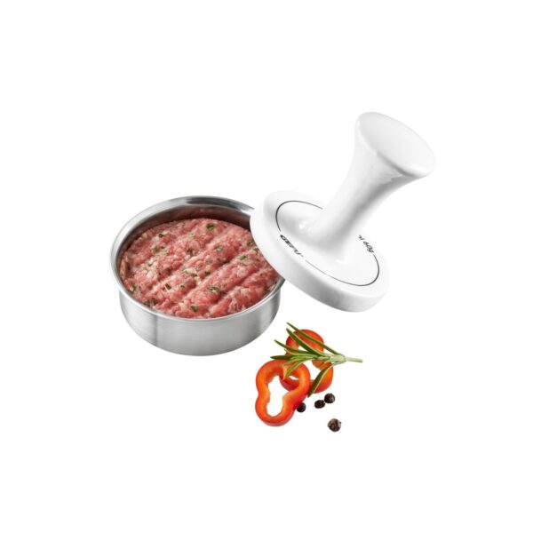 This mini party burger maker fills delicious finger-food burgers. To make vegetarian patties with polenta, buckwheat or spelt dough or classic meat patties, the mixture is put into the stainless-steel mould with an elevated centre and compacted with a press which also gives the burger its appetising ridged appearance. The elevation in the base forms a dimple in the patties which ensures their shape retention during frying. The set is easily cleaned in the dishwasher.