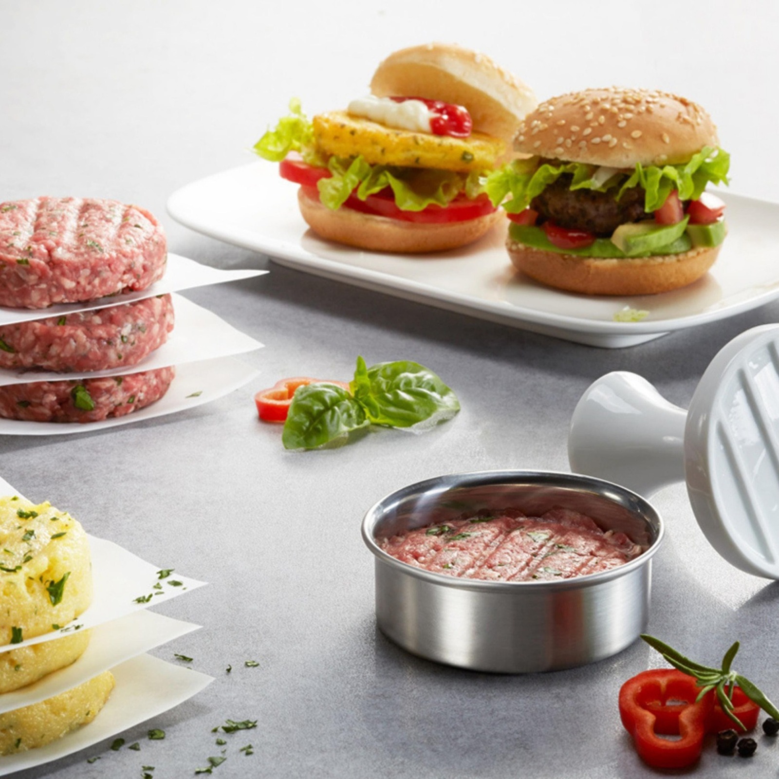 The party burger maker gives an ideal shape to finger-food burger patties– whether vegetarian or with meat.