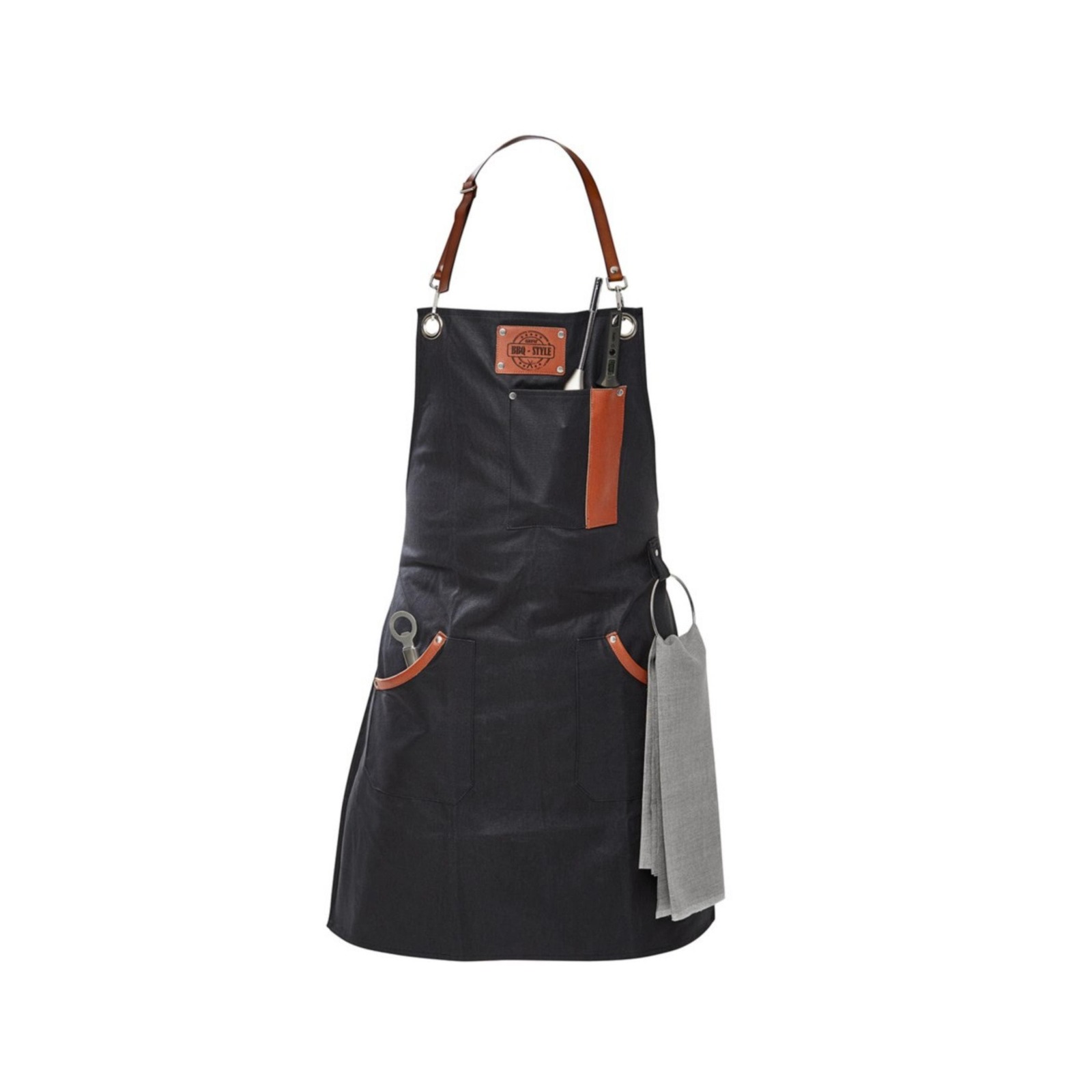 Not only does this barbecue apron with its high-grade leather appliqués look good, its well conceived details such as the tea towel loop and various pocket sizes are convincing. The adjustable neck and waist ties and the sturdy, resistant material made of waxed cotton ensure that it fits ideally and is comfortable to wear.