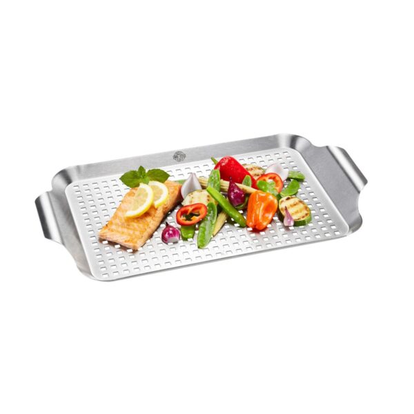 Tasty treats, such as barbecued vegetables, fine scallops or a delicious gilthead bream are cooked gently and healthily in the high-quality stainless-steel barbecue grill pan.